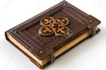 Vintage leather bound book with large brass ornament and amber stone in the center of the book. Laying on the table with view from the right side.